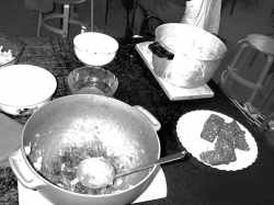 Man tager 9 kg kød, 10 kg kartofler, 30 løg + diverse krydderier. Dertil salat, rugbrød, rødbeder, flutes, gulerødder m. m., og så er retten klar på et par timer! Sådan! Til den medbragte kaffe var der igen hjemmebag.