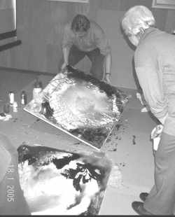 Kunstmaler Jürgen Baum malede under spisningen et par malerier, og alle kunne følge med i processen, som blev direkte projekteret op på et lærred. Jürgens malerier foregår på gulvet og ikke på staffeli.