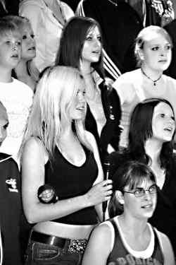 Dagen startede med at vi fik lov til at sove en time længere, og kl. 8.30 skulle vi møde inde i Salen, hvor Jakob Asmussen stod klar med sine sange. Så begyndte vi at varme stemmerne op, og derefter blev vi delt op i 3 store grupper, og der skulle vi øve på 6 sange, som Jakob havde fundet. Det var sjovt, Jakob sang meget godt, men vi undrer os over, hvordan han kunne komme sådan ned i tonerne!Vi synes det var temmelig svært at huske sangene fordi vi ikke så godt kunne se teksterne på skærmen, men vi fik da lært dem, så vi var klar til aftenens koncert. Alle vores forældre var blevet inviteret, og koncerten gik godt, og vi fik meget ros. Nu vil vi glæde os til vi skal til Harrislee for at give koncert i den danske kirke i Harrislee, for det er nu en gang rarere at komme ud med hvad det er vi har lært.