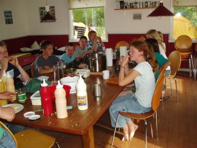 Søndag morgen, da vi alle var vågne og havde fået lidt mere tøj på – vi havde sovet med en del tøj på – fik vi friskbagte boller, cornflakes og havregryn. Bagefter samlede vi al halmen fra shelterne, og lavede et kæmpebål. Til slut inden turen gik hjemad fik vi kage.