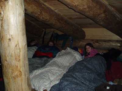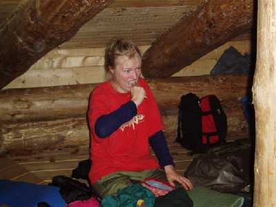 Det begyndte at blive temmelig til røget inde i Shelten og snart kunne man godt sammenligne os med nogle fisk, der skulle røges. Derfor blev der hældt kul på bålet, så vi ikke skulle blive helt røgforgiftede. Der blev grillet kød, og kogt pasta og lavet sovs, og så stod menuen ellers på pasta med sovs, kød og ketchup.