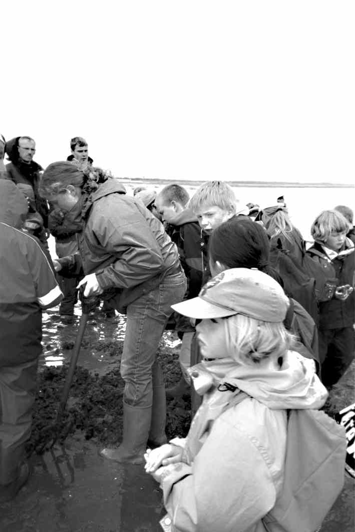 Turen var oplysende og interessant, vi gravede dyr op sandorme blev studeret med stor interesse, og østers blev åbnet, Søren Bjerringgaard spiste med stor glæde en, og meddelte at den smagte af saltvand, forskellige muslinger blev studeret, og vi stod med fødderne i vandet og mærkede at vandet steg langsomt til højvande. Så gik turen til et andet hjørne af vadehavet, her var jorden som kviksand, og der var selvfølgelig nogen der lige skulle prøve at mudre sig til næsten til ørerne, Bente som fulgte os viste os så hen til et sted hvor vi kunne vaske støvler inden turen gik hjem igen. Vi var hjemme kl. 13.30 og fik frokost, vi var sultne og der gik endda nogle rugbrød til., det var nu meningen at vi skulle have aktiviteter, men børnene lavede lejrpladser og hyggede sig så vi valgte at det skulle de have lov til.