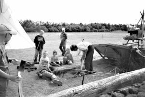 Vi ankom lørdag middag – fik pakket ud og etablerede bæverne bag hytten sammen med lederteltet (her sov dog kun Knud og Karna da Knud snorkede, og de andre ledere fortrak en efter en til hytten, dog ikke Finn, Henriette og Flemming som sov hos bæverne, Benny sov udendørs på et bord trods regn og rusk). Ulvene satte telt op i den ene ende af pladsen og lavede deres egen hyggelige lejr. Juniorerne satte deres tippi op i den anden ende og lavede en rigtig spejderlejrplads, som var rigtig flot. Da vi var etableret, spillede Finn og Benny rundbold med børnene og vi andre fik lavet aftensmad.