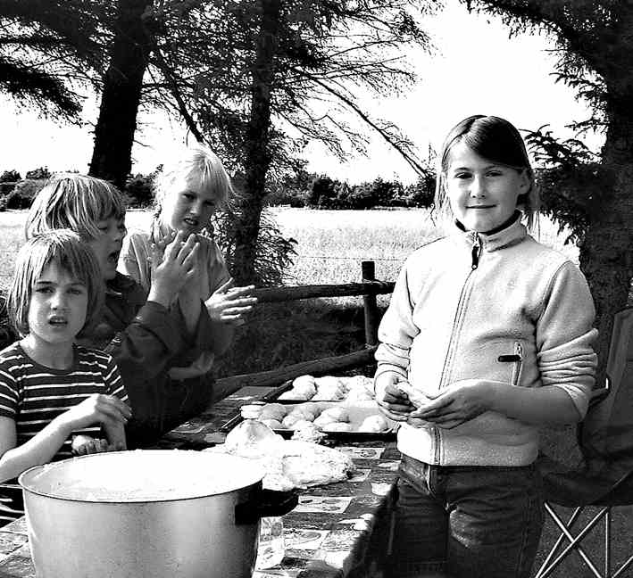 Snart skulle der jo laves aftensmad, vi skulle have skrabet 21 kilo nye kartofler og her nedsatte knud, Finn, Peter og en masser frivillige unger sig, det tog lang tid for man skulle lige lave en kartoffelmand eller trold og så videre, men de blev klar og kogt. Henriette tryllede dem om til varm kartoffelsalat, og juniorerne stegte 10 kilo medisterpølse. Karna begyndte at ordne salat, og inden længe havde hun hjælpere nok, de kom helt af sig selv. Maden blev fortæret med velbehag, vi var sent færdige men lejrbål blev det til og sengetid som sidste aften.