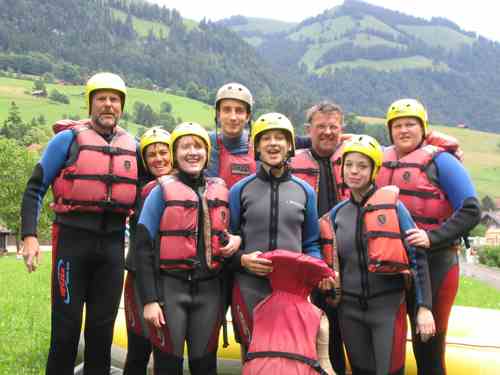 Riverrafting foregik i gummibåde 16 km ned af floden Simme – 8 mand plus en instruktør i hver båd og så fuld fart frem. Der var kun et par stykker fra Rinkenæs, der var få centimeter fra at vælte i vandet. Alle de, der ikke var gamle nok eller havde fravalgt riverrafting, tog på en rigtig legetur i dag. Samtlige blev udstyret med et 10-turs-kort til en bobbane ned af en bjergside. Banen, som var 750 meter lang, havde et højdefald på ca. 100m. Vi havde i aften arrangeret et internationalt lejrbål, som vi lavede som Sankt Hans Aften. Som Karsten sagde i sin velkomst til vore udenlandske venner fra Norge, Sverige, Schweiz; Holland, Portugal og USA: ”der er mange traditioner omkring Sankt Hans – én af dem er at det næsten altid regner…” og der gjorde det også hos os. Vi havde dog en fantastisk aften – trods regnen – alle takkede os for vores initiativ, og de danske spejdere havde en fantastisk international aften.
