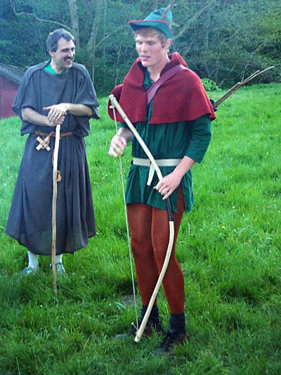 Derefter gik det løs… Der skulle laves tøj og våben til alle. Med hensyn til tøjet, så havde vi inden vi begyndte, en lille sjov episode – da en af de små ulve hørte at vi skulle lave tøj, så hun meget chokeret ud. Dette skyldtes at Robin Hood var iklædt orange leggins, en lårkort grøn trøje og et bælte (det så meget sjovt ud…) Miniulven forklarede os, at sådan noget ville hun i hvert fald ikke have på – forståeligt nok. Vi kunne dog berolige hende og de andre med, at de kun skulle have noget på der mindede om en pontio.