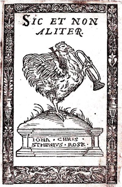 Sthen har afbildet sig selv som en kampberedt, trompetblæsende hane med mottoet ”Sic et non aliter” – således og ikke anderledes. Hanen og mottoet indgår også i Jens Lysters foredrag.